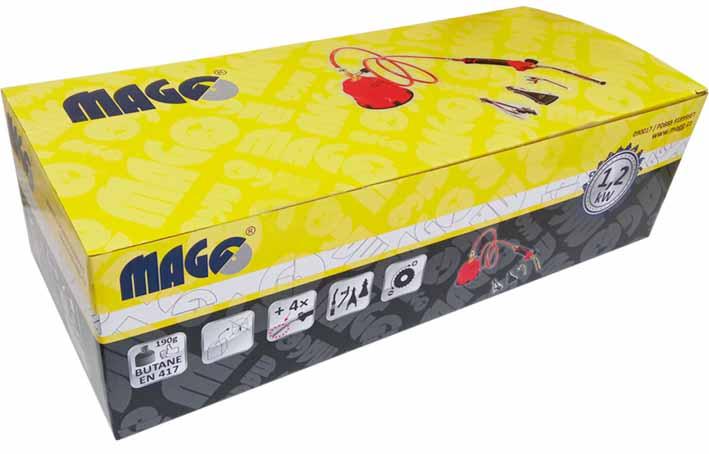Souprava obsahuje rukojeť, hadici a 4 vyměnitelné hlavy hořáku: pájecí hořák, opalovací hořák, klešťový hořák a pájecí hrot.