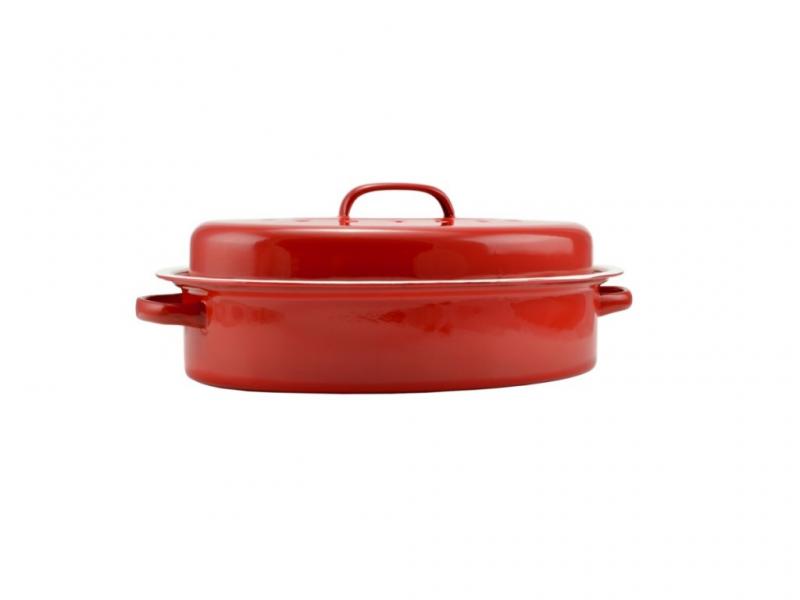 Smaltovaný pekáč s víkem, obsah 3,5 litru, ideální do trouby nebo pece.